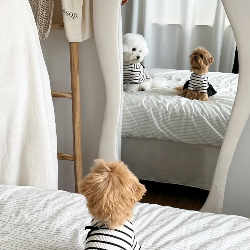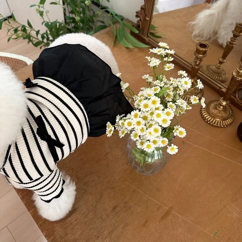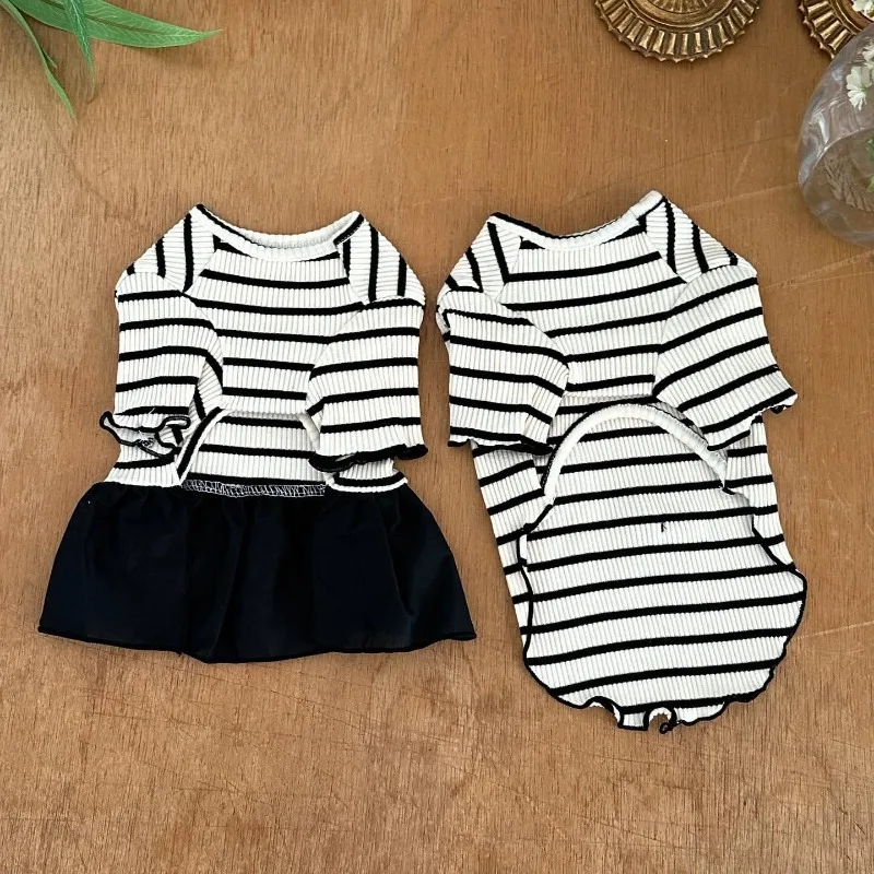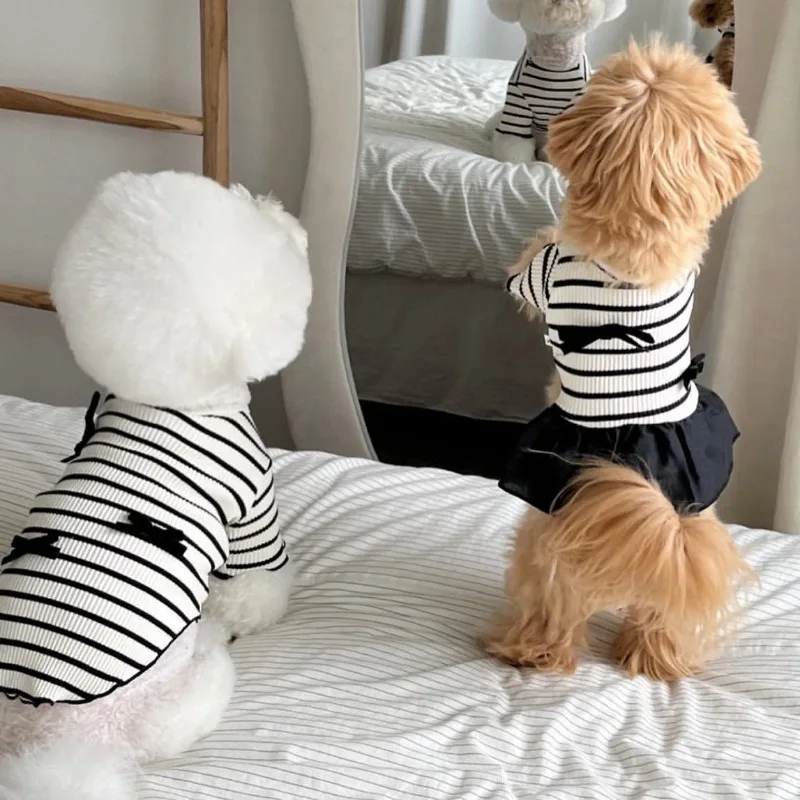 Summer Pet Bow Puppy Shirt Collar Strap Fashion Flying Sleeve Striped Dog Dress Black White Dress Teddy for Small Dog Clothes